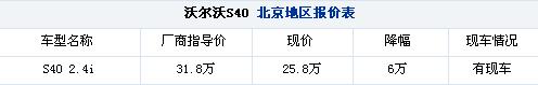 近日,编辑从沃尔沃4S店了解到,指导价31.8万元的沃尔沃S40 2.4i现金优惠6万元,售价25.8万元。有现车,颜色齐全。详情请见下表:
